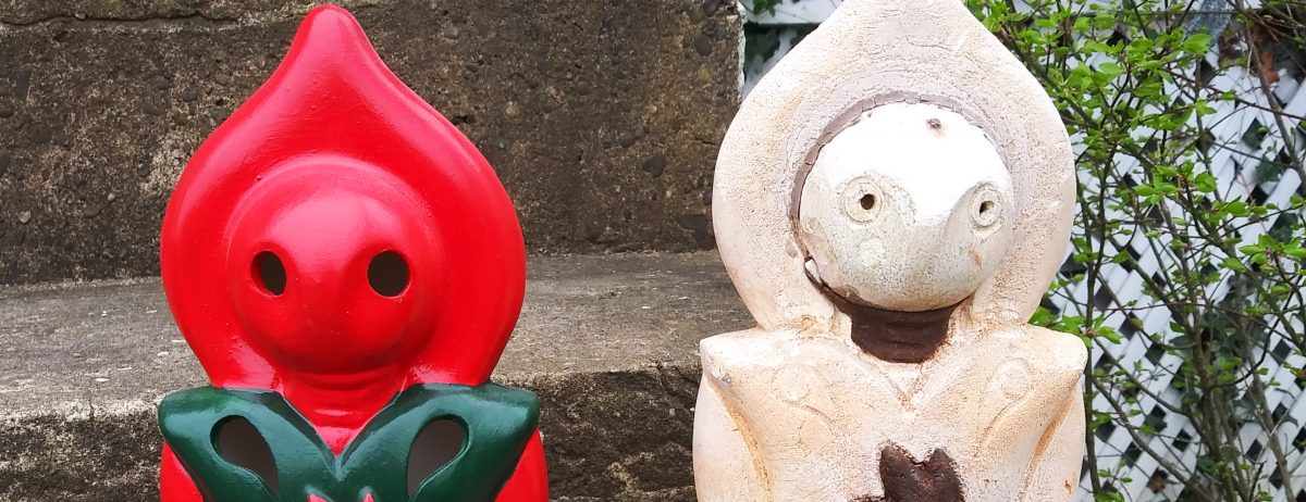 As you can see from the photos, it seems that the original intentions were that the lanterns would have more tear-drop shaped cutouts on the lower half of the figure similar to the cutouts commonly seen in the “chest” area. The museum isn’t aware of any vintage copies that contain these cut-outs. Whether they were even included in a production mold is unknown as well.